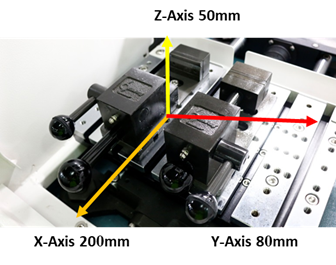 Precision X, Y, and Z-axis movement The longitudinal movement (X-axis) can be up to 200mm with feeding cutting. The horizontal movement (Y-axis) can be up to 80 mm with serial cutting. The vertical movement (Z-axis) can be up to 50mm. With the height movement, the consumables can be saved according to the size of cut-off wheel.