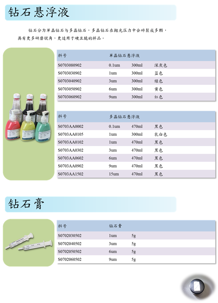 单晶钻石悬浮液体和多晶钻石悬浮液体,这些液体可用於制备各种不同类型的材料样品,能够为金相分析提供优质的表面。这些液体产品具有高度的耐磨性和磨削能力,可以有效地去除表面的瑕疵和不均匀性。同时,由於钻石悬浮液的磨削精度和控制能力优越,能够确保样品在制备过程中不受到形变或损坏,使得後续的金相分析能够更准确可靠地进行。