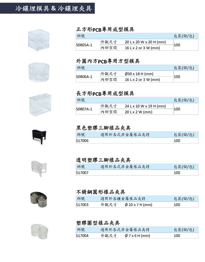 提供多种规格的冷镶埋治具,这些治具可根据金相制备的需求进行选择。透过选用合适的冷镶埋治具,并搭配环氧树脂、冷镶埋模具和玖钲金相真空镶埋机的使用,可以轻松满足各种样品制备的需求。