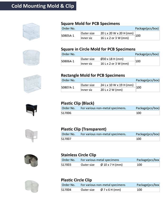 Multiple specifications of cold mounting specimen clips are provided, and these specimen clips can be selected according to the requirements of metallographic specimen preparation. By choosing the appropriate specimen clips and using them with epoxy resin, cold mounting molds, and TOP TECH’s vacuum impregnation machines, various metallographic specimen preparation needs can be easily met.