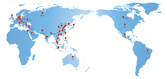 銷售據點及分佈:本公司國內外經銷及服務據點分佈在日本、德國、美國、英國、中國、韓國、菲律賓、越南、緬甸、泰國、寮國、斯里蘭卡、馬來西亞、新加坡、印尼、孟加拉、印度、巴基斯坦、以色列、阿拉伯等亞州各地、加拿大、墨西哥、巴西、俄羅斯、烏克蘭、土耳其、波蘭、匈牙利、羅馬尼亞、義大利、捷克…….等國家形成完整且綿密的行銷服務網。